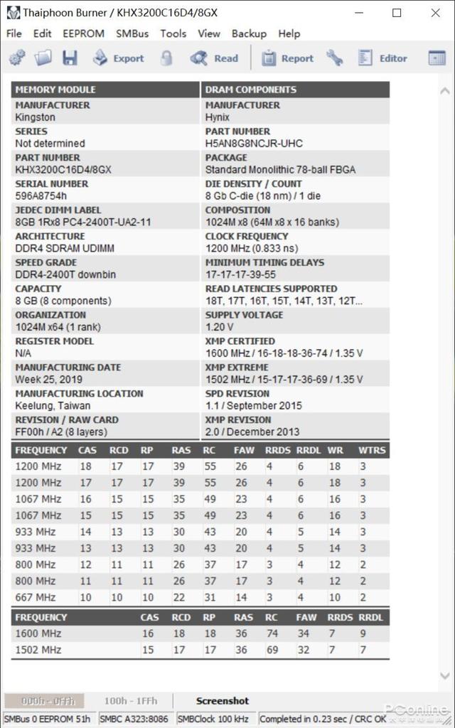 通过使用软件Thaiphoon Burner,我们可以对这款内存的具体参数一目了然!如图所示,雷电流光系列骇客神条内存是使用了SK海力士Hynix C-Die的内存颗粒,虽然不是三星B-DIE颗粒,但是许多DIY玩家都反馈SK海力士Hynix C-Die内存颗粒不错,是继MFR、AFR之后的第三代8Gbit颗粒,由于型号“H5AN8G8NCJR”后缀为CJR,所以被大家俗称为CJR颗粒,并且这个内存在AMD Ryzen平台上的表现更为出色,很多小伙伴都将其频率拉到3200MHz以上,所以这个颗粒也被誉为“AMD之友”,由此可以看到骇客神条Fury DDR4内存在颗粒上的表现可圈可点。