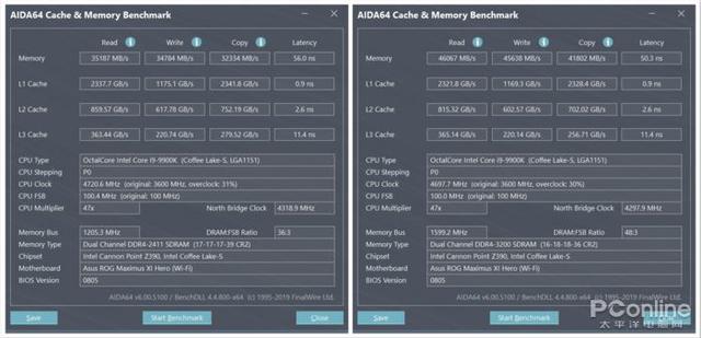通过AIDA 64内存测试,可以看到在不同频率下,内存的读写速度提升非常明显!在默认频率2400MHz频率下,读为35187MB/S、写为34784MB/S、复制为32334MB/S,而将通过XMP将频率定在3200MHz时,读为46067MB/S、写为45638MB/S、复制为41802MB/S,表现一目了然。