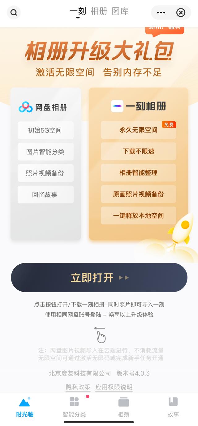 再看【首页】,相册、视频、文档、小说、音频是对网盘内容的分类,可以帮助我们随时管理自己的文件,功能不错,但是我用的不多,也就是相册点的比较多,但是这个相册为什么要再推【一刻】APP,一定要把用户的手机塞满百度全家桶就开心?