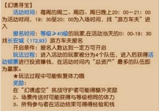 每周二、周四、周日晚上,梦幻西游会举行幻境寻宝活动,这是一个快速恢复体力的良机。在幻境中,人物每次移动都会有几率增加体力、活力,场景传送石还可能获得与等级相同的体力。平时有些服务器会因为人数不够而不能开启,但是元宵节、教师节等对体力恢复需求较大的时候还是很有可能开启的,大家可以尝试着报名哦,一旦开启那就体力无虞了!