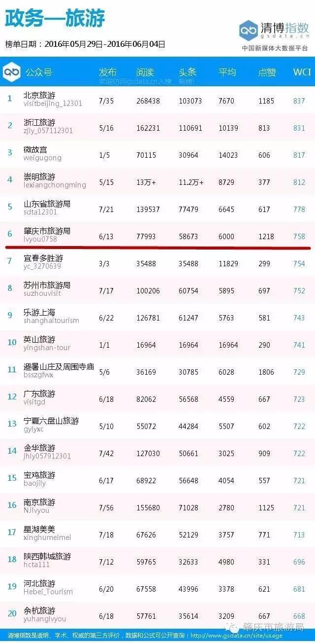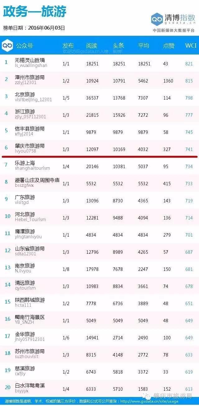 6月6日,中国新媒体大数据权威平台“清博指数”发布一周全国政务微信影响力榜,该周共采集政务账号数量411654个,文章发布统计时段为5月29日(0点)-6月04日(24点),榜单涵括政务总榜、党建、宣传、团委、政府、公安、司法、纪检、税务、气象、旅游、文教等,各账号竞争也非常激烈。其中在“政务-旅游”中,“肇庆市旅游局”微信号列一周全国旅游榜第六,广东旅游系统第一,这已不是“肇庆市旅游局”微信第一次列第一的位置。内容好不好,大家说了算!“肇庆市旅游局”一直都在努力做得更好,感谢大家的关心与支持!有你,真好!