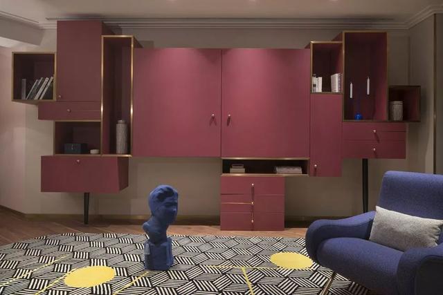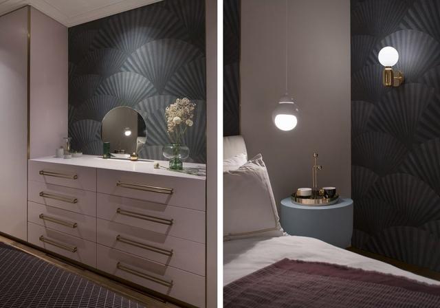 为女主人专设的瑜伽空间,纯粹静雅的色调中,不时点缀着淡淡的粉色,金色的开关,把手等在细节上突显了业主对于精致生活的考究。连系这两个空间的,便是开放式的家庭空间,比起正式的客厅,更是多了一份温馨和甜蜜,考虑到业主将来的生活习惯,也于此配备了足够的收纳空间。在家具的选择上,Thomas Dariel 挑选了更柔软舒适的款式,因为他相信,在这里,家人之间,少了那一份拘束,在整个设计氛围中更应当烘托这种亲和力才是。同样座落于第一层的,还有为亲属配置的房间,墙面的几何图案,延伸到浴室又幻化成不一 样的语言,展现了空间的个性化。