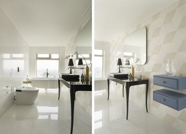 ▼主卫洁白的大理石勾嵌古铜色金属线条