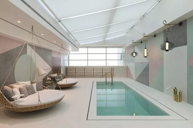 一旁随即转入的,便是那独一无二的室内泳池,配备的尖端科技的同时,在空间氛围的营上,Thomas Dariel 选用了与水面相呼应的浅色调,用极其简约的手法演绎设计感:纯粹,低调。 抽象的几何图案及略带现代中式感的壁灯,又灵巧地赋予空间平衡感。