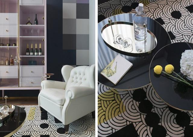 一入公寓便令人惊叹,映入眼帘的是如同钻石切面般的雅白色旋梯,与地面黑白色大理石的几何图案交相辉映,给予前来宾客第一眼的视觉震撼的同时,将楼梯设于中心位置又起到分割不同空间区域和连接楼层的功能之外。