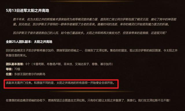 不过这次SW团本给玩家们送了一个大福利,或者说是给普通玩家们赠送了一个福利,对于不少玩家来说开门任务的难度过大,因为一个人根本无法完成开门任务而组人又花时间只能被迫寻找排骨人了。但是这次暴雪直接在蓝贴中表示本次不需要开门任务,玩家们可以直接在太阳井团本更新的首日开启开荒之旅,估计不少排骨人已经哭昏在电脑前了。