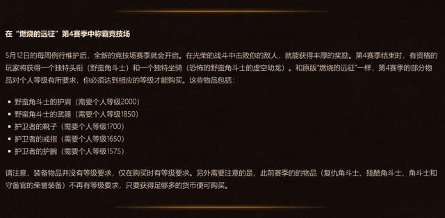 PVP商店中也更新了不少装备,比如说野蛮角斗士的护肩以及武器,还有护卫者系列的装备,并且在该赛季结束的时候有些玩家将有可能获得头衔,另外一个则是有机会获得该赛季专属的坐骑恐怖的野蛮角斗士的虚空幼龙,相信不少玩家会去刷个人等级来获得这些奖励。