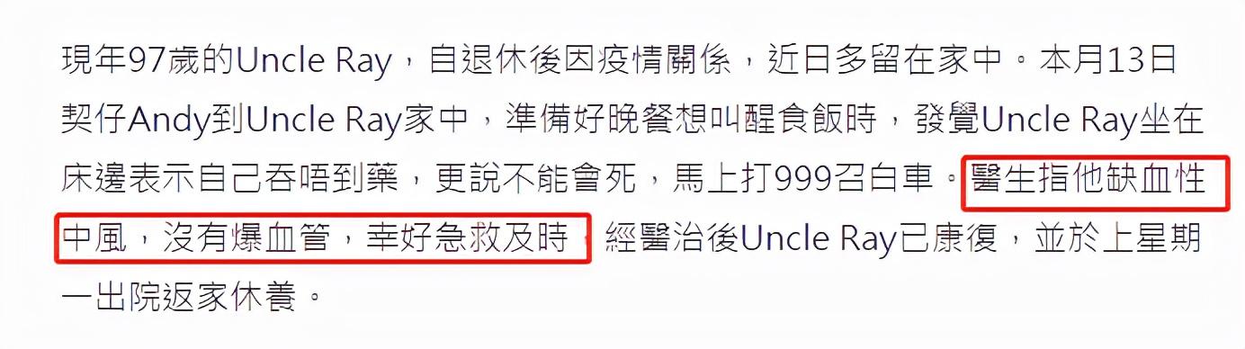 1月25日,据港媒报道,97岁的Uncle Ray(郭利民)突然中风,所幸干儿子及时发现,并将他送医治疗。