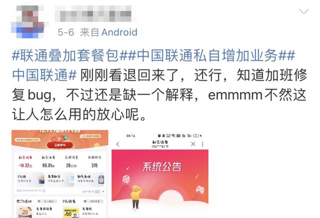 微博@中国联通客服于5月7日表示,“由于系统升级导致部分用户被异常扣费”。