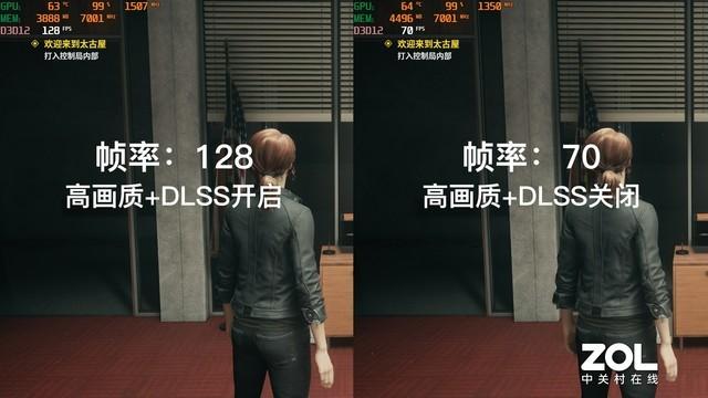 在相同画质下关闭光线追踪,关闭DLSS时的帧数为70帧,而开启DLSS之后帧数高达128帧。可以说DLSS技术让原本只能流畅运行3A游戏的笔记本,直接蜕变为入门电竞的水平,对于玩家来说也有积极意义。当然,还是建议大家开启光线追踪后进行游戏,对比可以发现开启光线追踪后,玻璃反射室内的画面更贴近真实,游戏体验更佳。