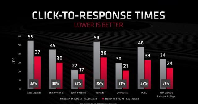 然后是“Radeon Anti-Lag”,简称RAL,可以大大缩短从鼠标点击到游戏响应的时间,幅度基本都在30-35%左右。