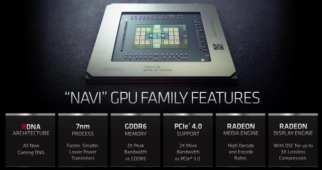GCN架构沿用了八年之久,如今A卡终于新生,引入了全新设计的RDNA架构,首个核心代号为Navi,面向中高端游戏市场,而且和第三代锐龙处理器一样采用了最新的台积电7nm制造工艺,同时在游戏卡上首发PCIe 4.0,还在A卡历史上第一次引入了GDDR6显存。