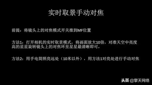 对于新手来说拍星空最难的是对焦,相机对焦系统在黑暗的环境很难像白天一样正常工作,所以需要掌握在黑夜里手动对焦的技术,如果你能在白天用手动对焦模式拍摄出很远距离的小目标和自动对焦模式同样清晰,那晚上对焦就更容易成功。