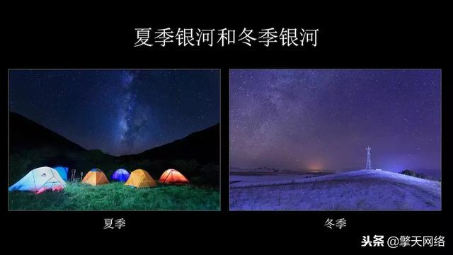 由于地球的自转和公转的影响北半球只有在夏季的晚上才能看到银心,又由于纬度的不同,银河的形态和出现时间也略有差异。