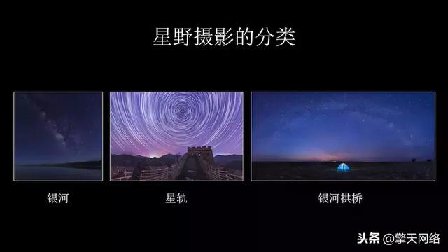星空摄影主要分三大类:星野摄影、深空摄影和天体摄影,我们通常所说的星空摄影指的是第一类星野摄影,星代表天上的星星,野代表野外的地景。本文所说的星空摄影指的是星野摄影,不包含深空摄影和天体摄影,而星野摄影从拍摄技术来分类可以分为以下3类(银河、星轨、银河拱桥)。