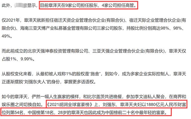 2021年,章泽天与刘强东夫妇就以1880亿元人民币的财富位列第54位,在中国居第18名,年仅28岁的章泽天也因此成为中国榜前二十名中最年轻的富豪。