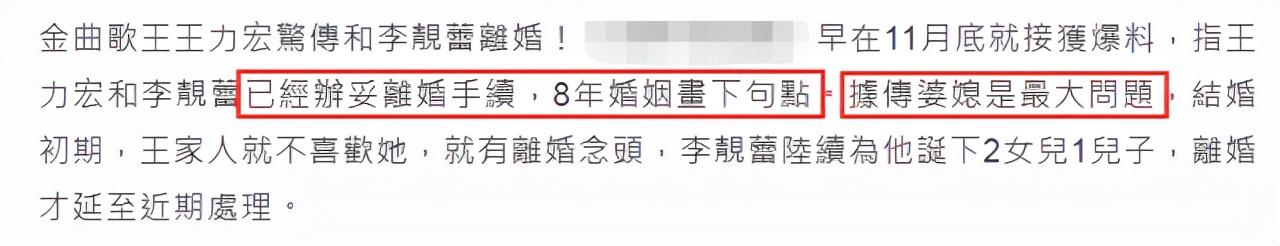 据台湾报道,王力宏和李靓蕾的婚姻走向尽头疑似是因为婆媳关系不好。一开始,王家人就对这个儿媳不太满意。原先王力宏的工作事宜都是妈妈负责,和李靓蕾结婚后,女方想掌握王力宏的工作及财政大权,让王家人尤其是王妈不满。