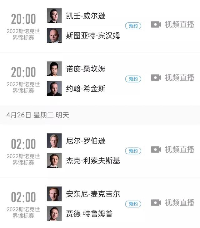 20:00世界斯诺克锦标赛-第二轮,桑坎姆vs希金斯,CCTV5+直播。