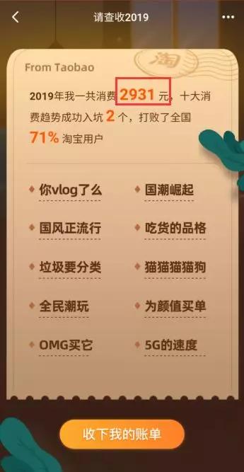 在支付宝出年度账单之前,手机淘宝已经发布了2019年度账单。在淘宝搜索「请查收2019」即可查看全国人民的消费趋势以及在最后有自己的年度账单,鲜姐通常电子产品在京东、小东西在拼多多的情况下,手机淘宝依旧造了近3000块大洋。