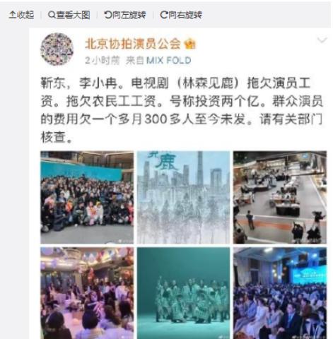 2月17日下午,一个名叫“北京协拍演员公会”账号发文称由靳东、李小冉主演的电视剧《林深见鹿》拖欠剧组几百人的工资。该爆料者声称为了讨要工资,数百人高举横幅、字牌进行抗议讨薪,还要求相关部门对此核查。