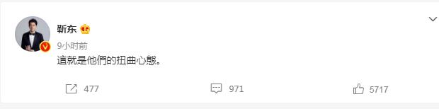随后,靳东再发文称:“这就是他们的扭曲心态”。