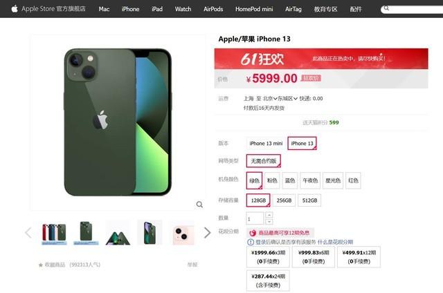 天猫商城的Apple Store官方旗舰店仍然采用官网的价格5999,不过搭配天猫商城的活动有每满300减50,移动端还可以抢5000-200优惠券,可以做到4849元到手,不过目前只有蓝色红色有现货,其他颜色版本要等2周以上。