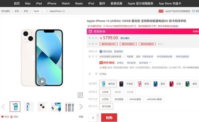 今年618京东打出“苹果京东更便宜”的口号,放出了很多神券,其中iPhone 13全系可用的1001券,再加上京东原价比官网要便宜一些,iPhone 13最低到手价为4798元,约为官网价格的8折,且全色系有现货,京东物流更快捷。