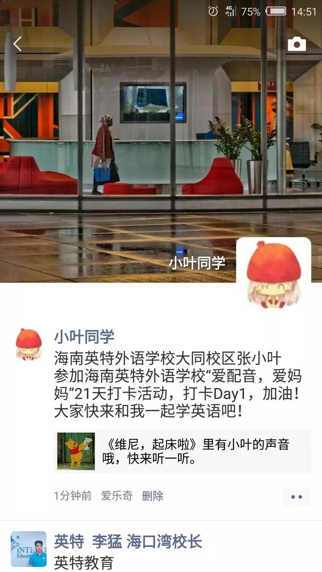 学校+年级+姓名+参加海南英特外语学校“爱配音,爱妈妈” 21天打卡活动。打卡Day1, 加油!大家快来和我一起学英语吧!