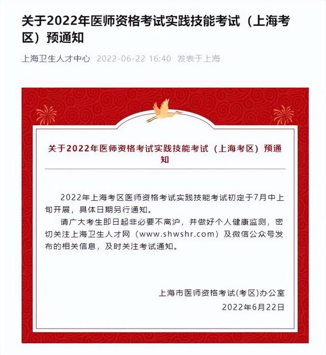 有地区缴费已开始,有的地区竟还没开考,这速度差,啧啧啧~不过22年上海考区医师技能考试的开考时间已经大致确定了!初定于7月中上旬开展,具体日期另行通知,以下为官方原文大家悉知!