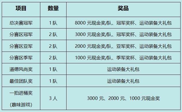 奖项设置:总决赛冠军(1队)、分赛区冠军、亚军、季军(合计6队)、道德风尚奖(1队)、最佳团队奖(1队)、一拍进桶奖(3人)。