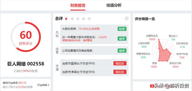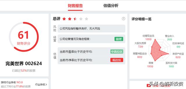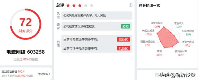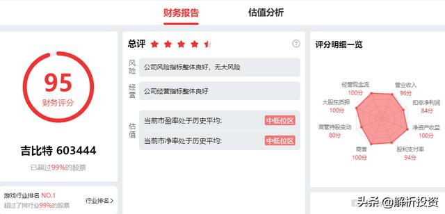 吉比特:2018年之后业务逐年增长,股查查财务评分95分,优秀。参考近五年复合增长率21%,公司合理市盈率为20倍,目前市盈率19倍,整体来看是一个比较好的标的。