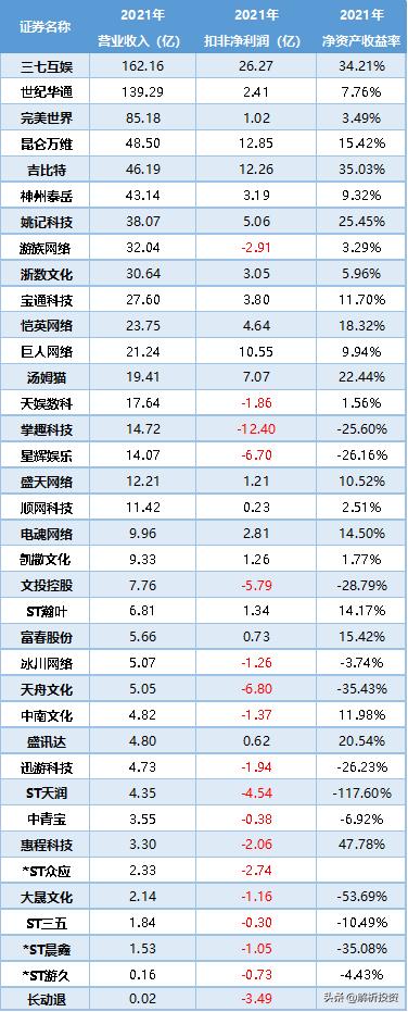 游戏行业一共有37个上市公司,其中有25家公司利润低于2亿,这里面亏损的有18家,所以能看的公司并不多。我们只选取比较有看点的几家公司来做个详细分析。