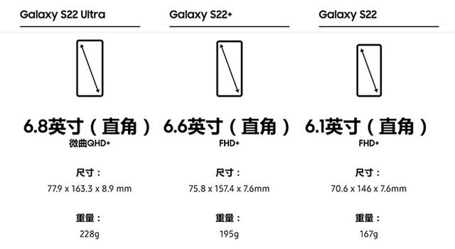 三款新机中,S22和S22+维持了与上代相近的设计,正面直屏升级为四边等宽的超窄边直屏,得益于打孔前摄居中以及圆角设计,亮屏之后更具美感。S22与22+均为第二代动态AMOLED屏幕,尺寸分别为6.1英寸和6.6英寸,二者的屏幕峰值亮度及对比度也不一样,依次为1300尼特和1750尼特、300万:1和200万:1。
