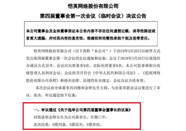 值得一提的是,2019年3月20日,上市所属地域为福建泉州的恺英网络股份有限公司召开的第四届董事会第一次会议上,全体董事一致选举金锋先生为新任董事长。金锋先生任董事长及聘任新一届董监高的产生,标志着恺英网络完成新老领导班子的交替,也标志着恺英网络迈入全速发展的新阶段。
