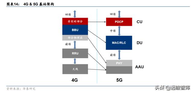 相比于4G基站,5G基站架构发生了比较大变化:4G基站架构主要包括无源天线、远端射频单元(RRU)和基带处理单元(BBU);在5G时代,无源天线、RRU 以及部分物理层将演进为有源天线单元(AAU),而 BBU则会拆分为分布单元(DU)和集中单元(CU)。