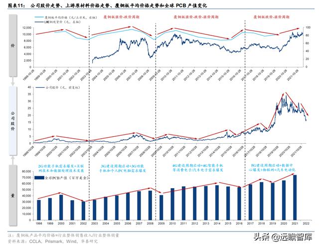 3)第三个阶段是 2009-2016 年:移动通信网络进入 4G 时代,4G 智能手机等消费电子产 品成为下游需求新亮点,但期间受上游原材料价格回落及覆铜板行业自身产能过剩等因素的影响,覆铜板价格也出现较大下跌,在价格和需求的综合作用下,公司股价先后走出两个周期性行情;