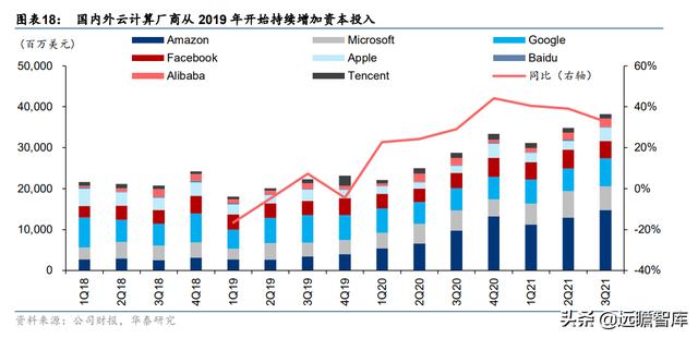 随着近几年云计算的快速发展,全球数据量及数据流呈现出井喷式的增长,这也加大了对数据中心建设的需求。我们注意到全球云计算大厂从 2019 年开始持续加大他们的资本支出。其中,中美两国主要大厂(包括亚马逊、微软、谷歌、Facebook、苹果、百度、阿里巴巴以及腾讯)1Q19 的资本 开支为 180 亿美元,而 3Q21 的开支已经增长至 382 亿美元,增长了 112%。