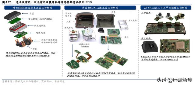 从博世 MMM1Crn 毫米波雷达、法雷奥 SCALA 激光雷达和 ZF S-CAM4 三目及单目摄像头的拆解图可以看到,各类传感器均需要 PCB 作为承载,尤其是毫米波雷达和激光雷达,还会用到工艺难度更大、价值量更高的高频 PCB 板及高密度 HDI 板。