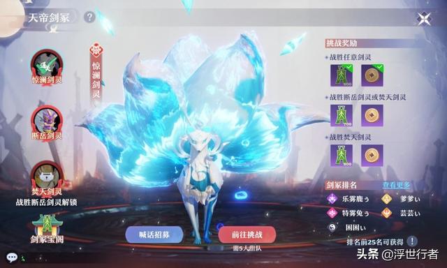 天帝剑冢就相当于一个难度副本,每周周五10点到下周三24点之间开启,三只剑灵可供挑战,挑战成功可以获得一定数量的货币剑玉,可以用来在剑冢宝阁购买逍遥游残魂,蜃珠,神兽蜃珠,果脯,自选红色符文,天帝琼浆等珍稀道具。