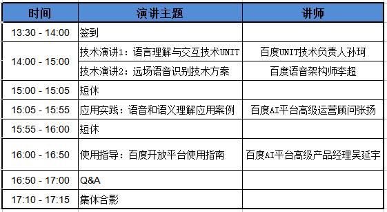 为了帮助开发者深入了解 UNIT 开放技术、语音能力,更加充分利用这些人工智能技术进行开发与上线——74 期百度技术沙龙,我们将从 UNIT 核心技术解析、远场语音识别方案、语音和语义理解应用实践、百度开放平台使用指南四个维度,对百度智能交互技术做全方位的分享和解析。