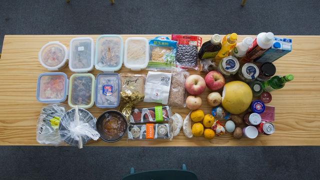 旧冰箱冷藏室容量111L,里面的所有食物如下,一共50件: