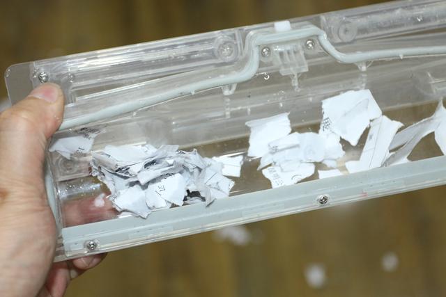 打开垃圾盒后,这些碎纸全在垃圾盒中了,垃圾盒周围有橡胶密封圈,污水或灰尘不会泄漏。