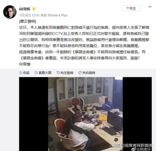 随后向雪怀也发出“严正声明”,与游威划清界限,宣布“华语金曲奖”不再由其担任秘书长。
