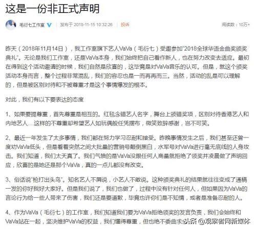 昨天(2018年11月14日),我工作室旗下艺人VaVa(毛衍七)受邀参加“2018全球华语金曲奖颁奖典礼”。无论是我们工作室,还是VaVa本身,我们始终把自己看作新人,也在努力改变去适应。最初在得到这个活动邀请的时候,我们自然是欣喜的,这毕竟是对VaVa音乐的认可。但是,就这个颁奖活动本身而言,整个过程非常混乱,我们的容忍也是一而再再而三。当然,活动的乱是可以理解的,但是被区别对待和不被尊重才是这个事情爆发的根本。