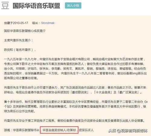 但是国际华语音乐联盟的豆瓣小组简介中,清楚地写着游威是“华语金曲奖创始人/总策划”。