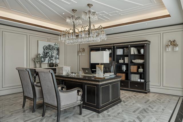走廊的几何拼花,地面的成品花砖,客厅墙面的黑色线条,卫生间地面的几何图案,天花上层层叠叠的线条装饰以及空间里金属的、水晶的、绸缎的、看得见的、触摸到的,一切的一切都是设计师献出的关于Art deco 的创想。