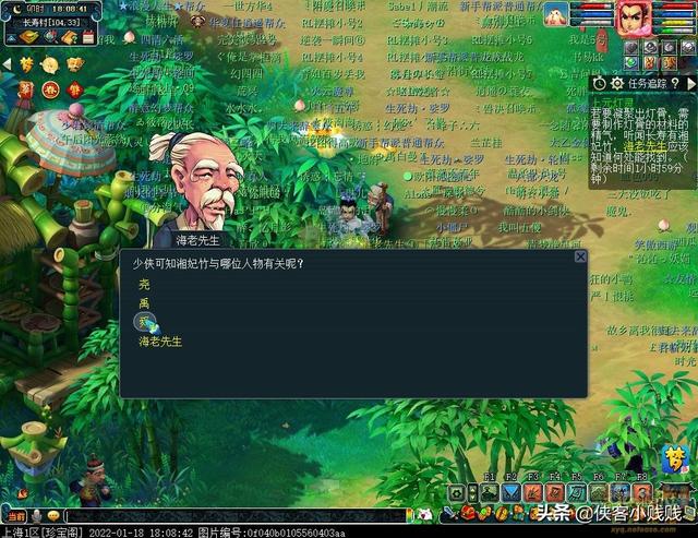 湘妃竹灯骨:领取任务后找海老先生询问关于湘妃竹的事情,此处选择“舜”。