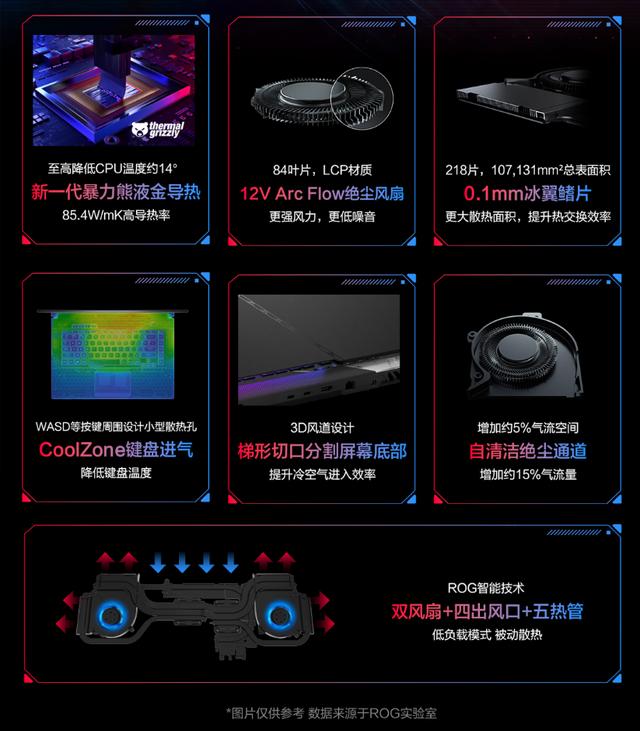 IT之家了解到,此款笔记本具有 3D 风道设计,采用高密度鳍片。产品配备四扬声器、双 AI 降噪麦克风,支持杜比全景声。RGB 键盘具有 2.0mm 键程,有着闪击技术。