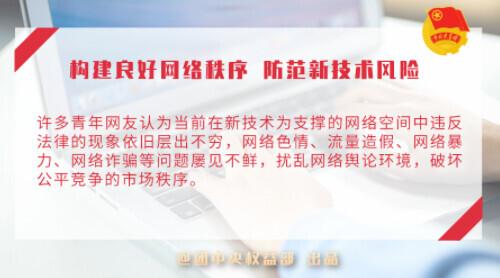 许多青年网友认为当前在新技术为支撑的网络空间中违反法律的现象依旧层出不穷,网络色情、流量造假、网络暴力、网络诈骗等问题屡见不鲜,扰乱网络舆论环境,破坏公平竞争的市场秩序。