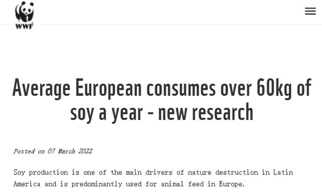 3月7日,非政府环境保护组织世界自然基金会(WWF)网站发表了一篇题为《一项新研究显示,欧洲人平均每年消耗60千克大豆》的文章,该组织委托Profundo进行的一项关于欧洲大豆供应链图谱的研究显示,在欧盟27国和英国,人们爱吃肉、蛋、鱼和乳制品的的饮食习惯导致市场对大豆的需求上升,因为大豆制品是重要的动物饲料。